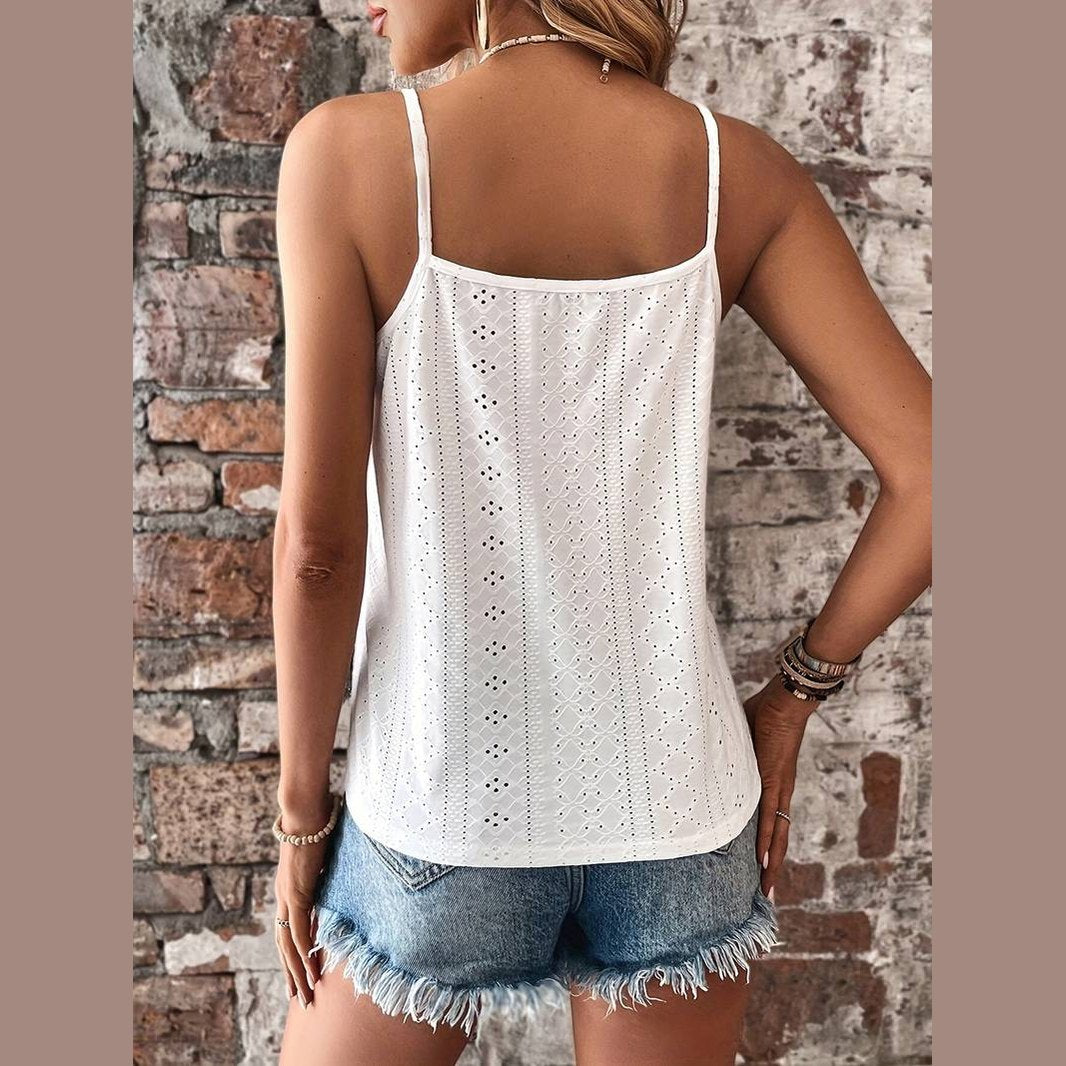 Découvrez l'essence du style et de l'élégance avec le haut en dentelle Gigi, un vêtement soigneusement conçu pour vous offrir le look que vous désirez. Élevez votre garde-robe estivale avec ce top en dentelle orné de détails en œillets, d'un décolleté en V décontracté et de fines bretelles spaghetti pour un look délicat et féminin. Ce haut est indispensable pour toute passionnée de mode.