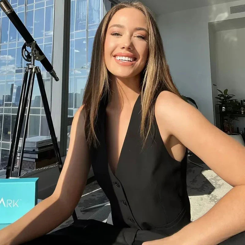 Dotée d'une coupe courte et d'épaules marquées, cette pièce sans manches structure la silhouette sans l’alourdir. Son décolleté en V profond et sa fermeture épurée renforcent son charme minimaliste.