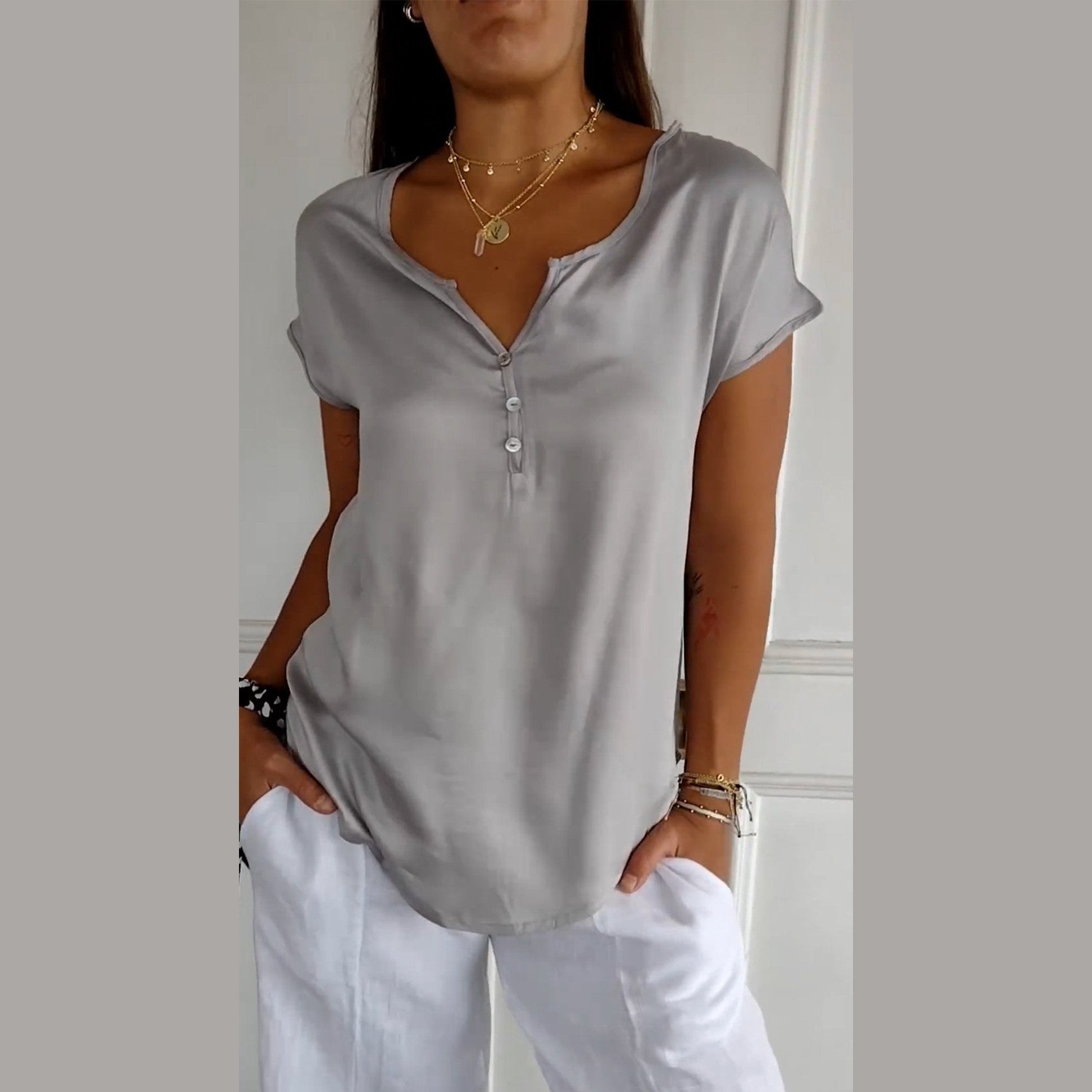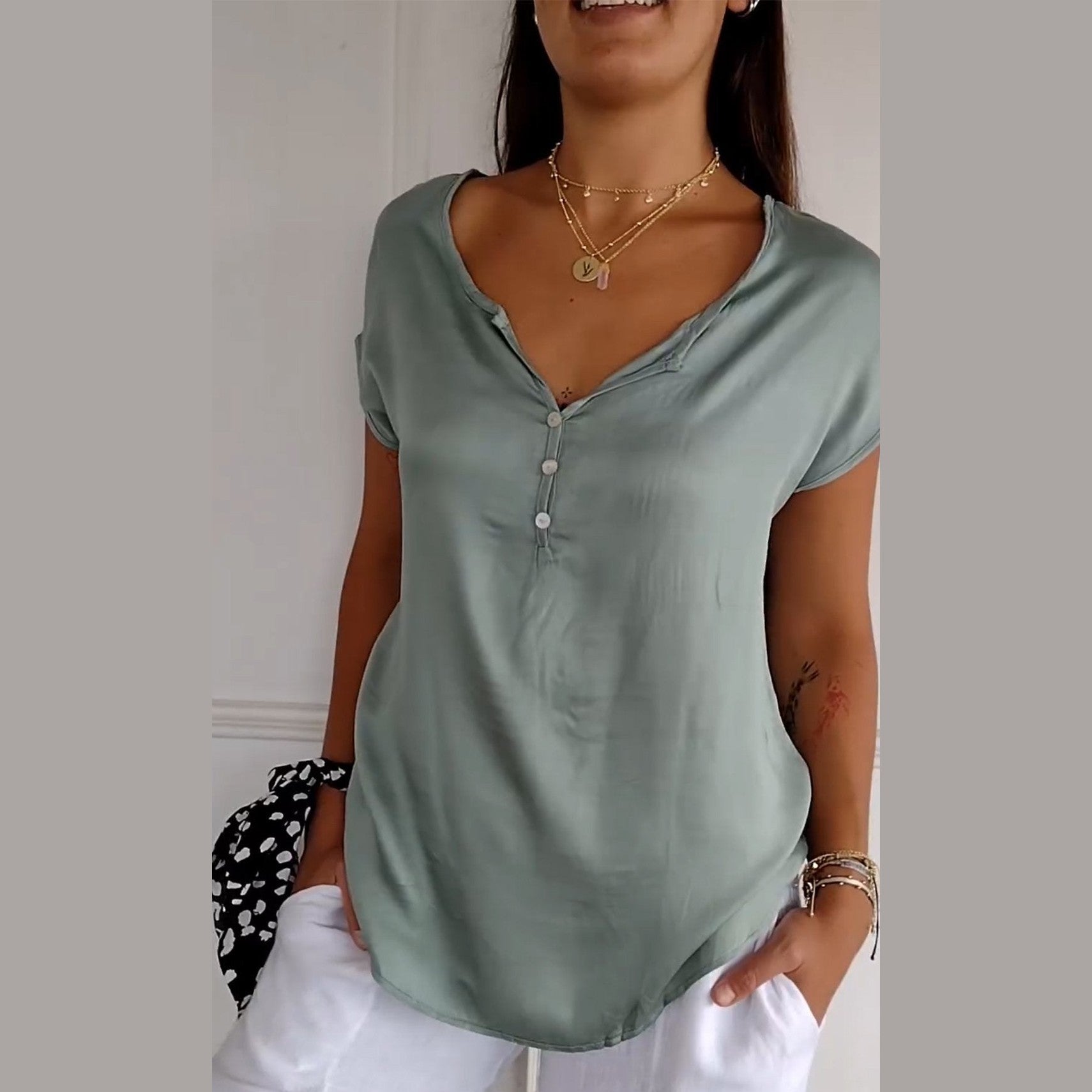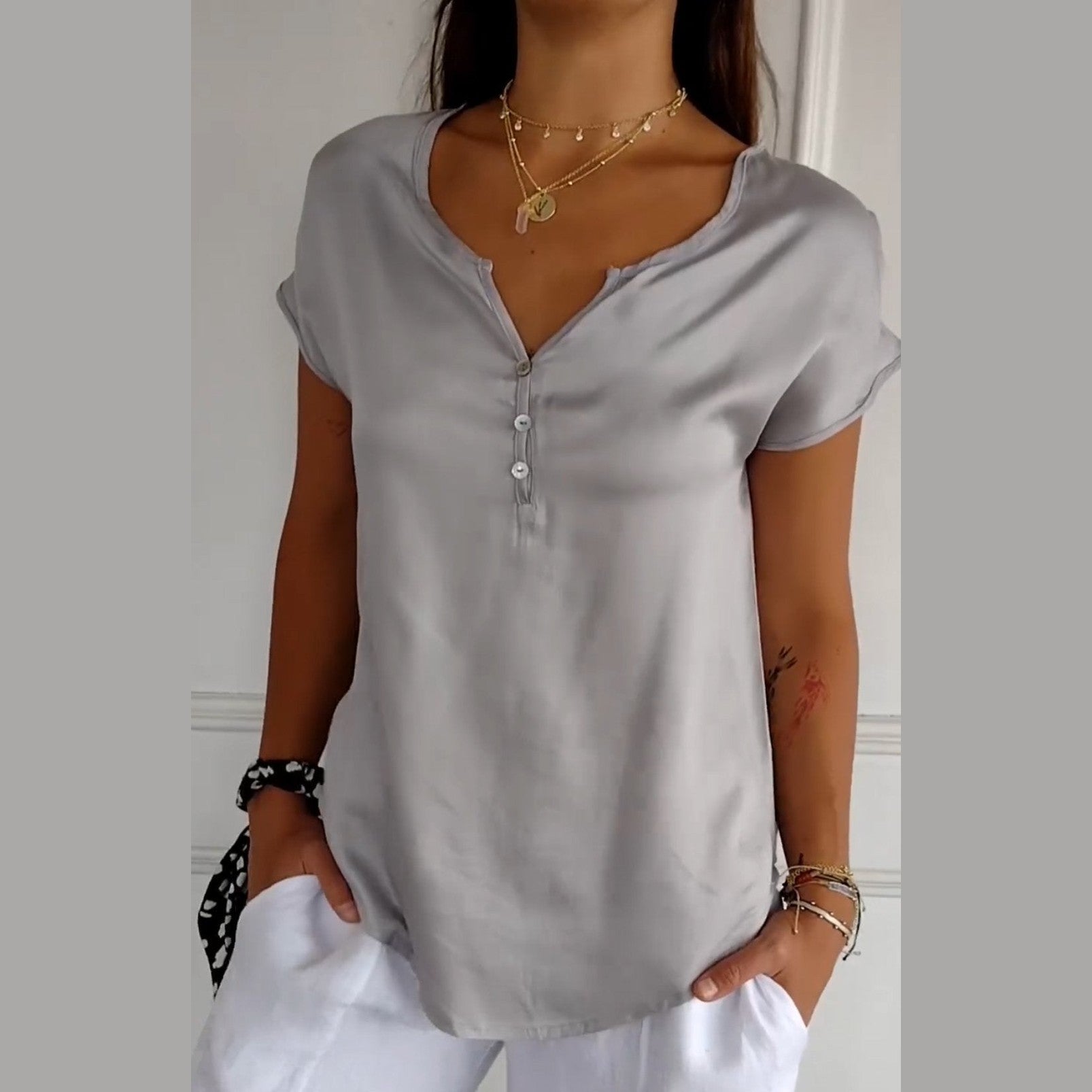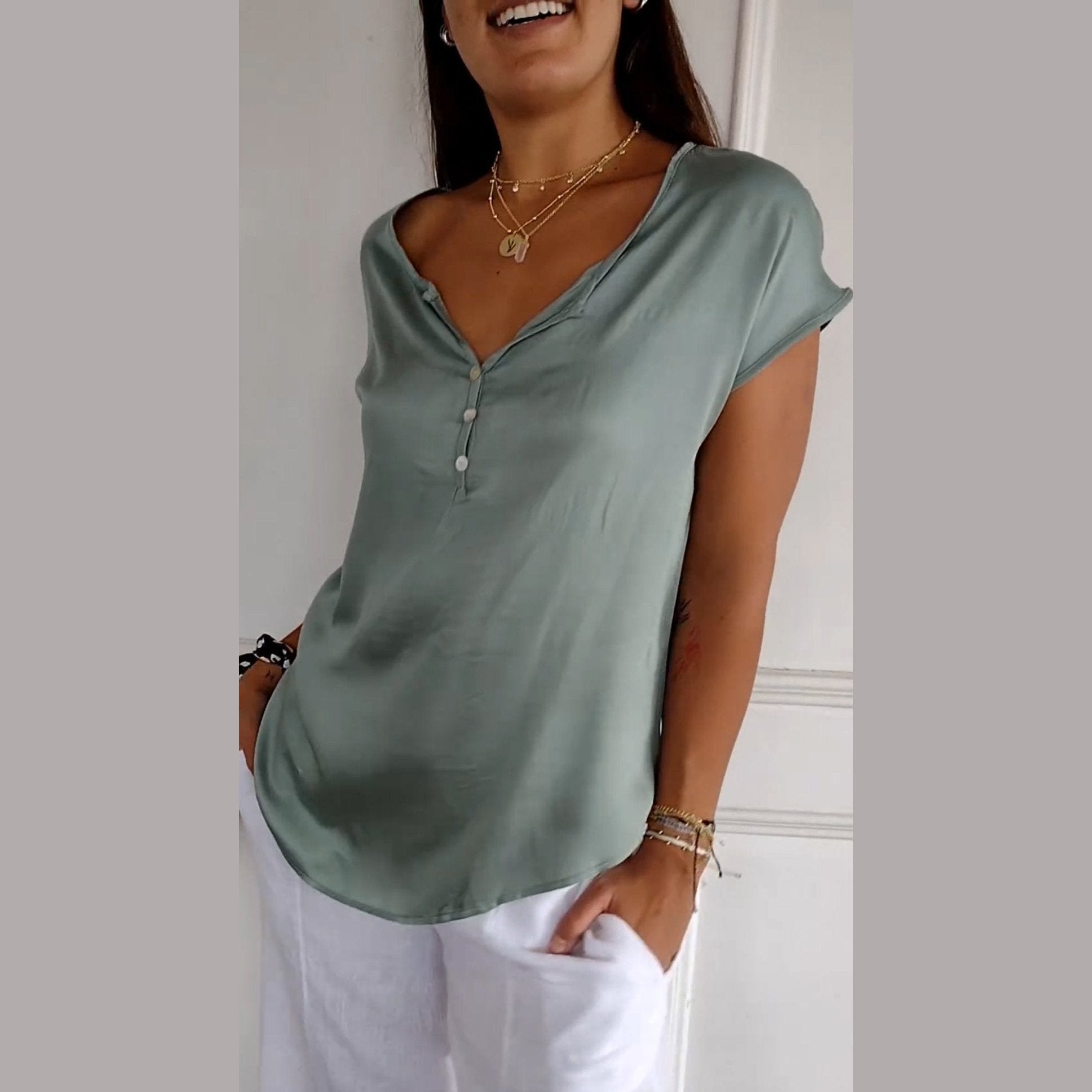 Le chemisier Noélie se distingue par son décolleté en V chic qui met en valeur votre cou et votre décolleté tout en apportant une note sophistiquée à vos tenues casual. Son design intemporel s'adapte facilement à différents styles, que ce soit pour une sortie décontractée ou une réunion informelle. Ce haut est idéal pour celles qui souhaitent allier confort et élégance.