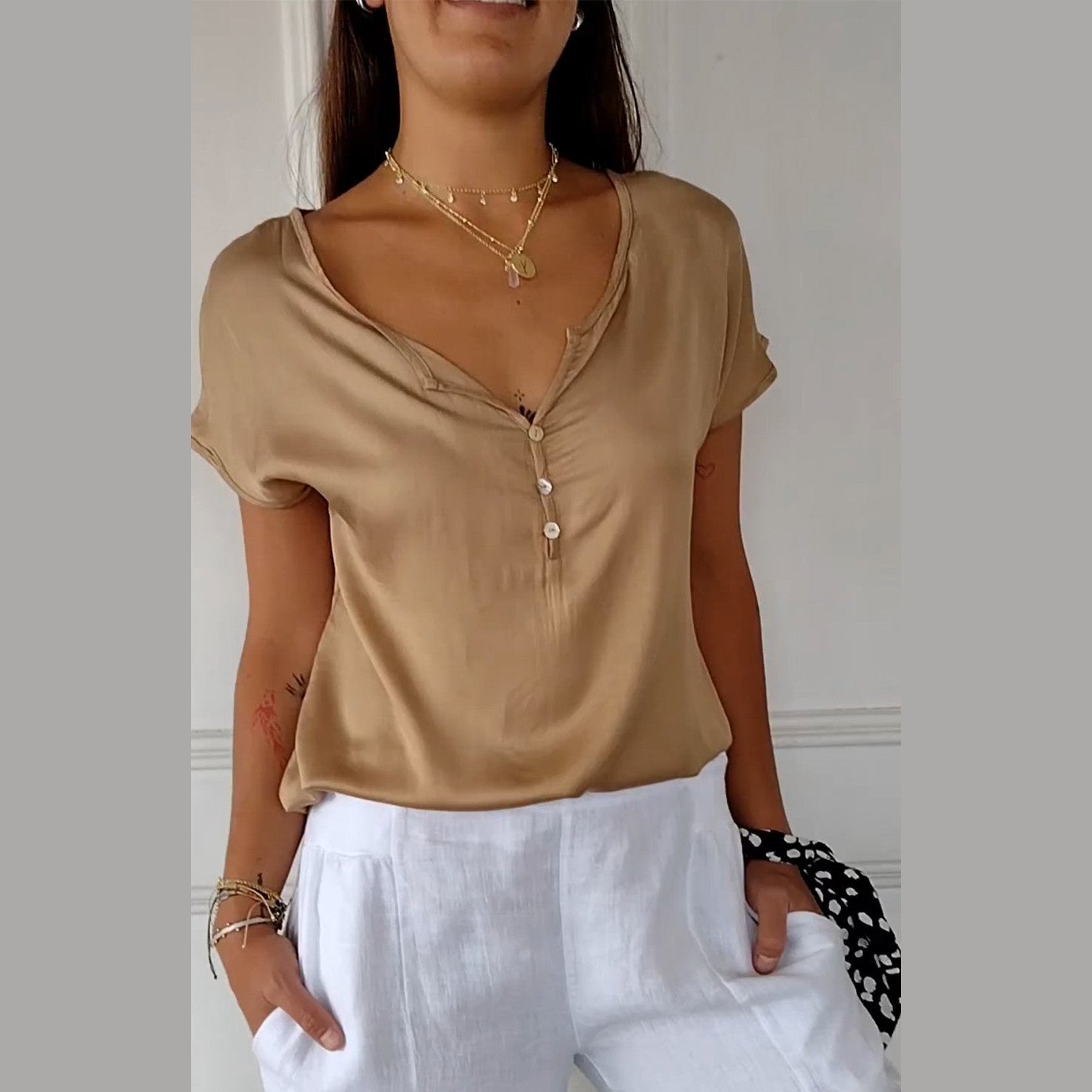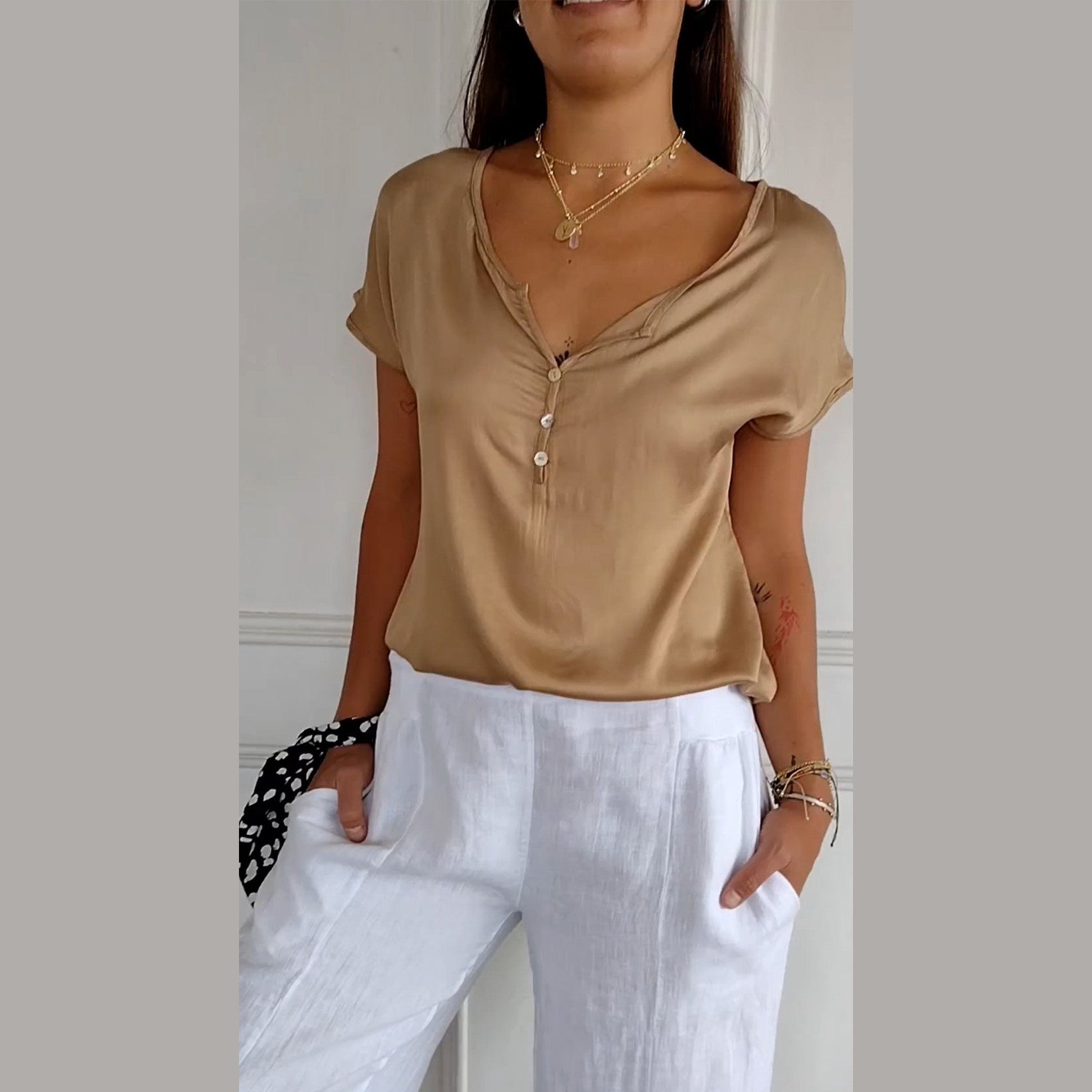Pour un look estival parfait, associez le chemisier Noélie avec des accessoires en or ou en argent pour ajouter une touche de brillance. N'hésitez pas à le porter avec des sandales en cuir pour un style casual chic ou avec des ballerines pour une allure plus raffinée. Pour un effet encore plus moderne, ajoutez une ceinture fine à votre taille pour accentuer votre silhouette.